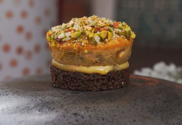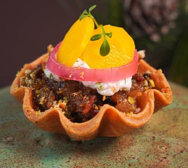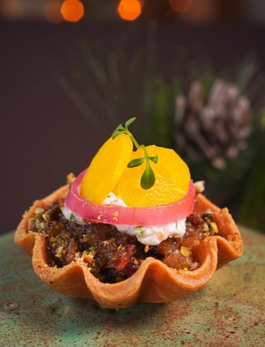 Tartaletė su karamelizuotais svogūnais, šonine ir maskarponės kremu