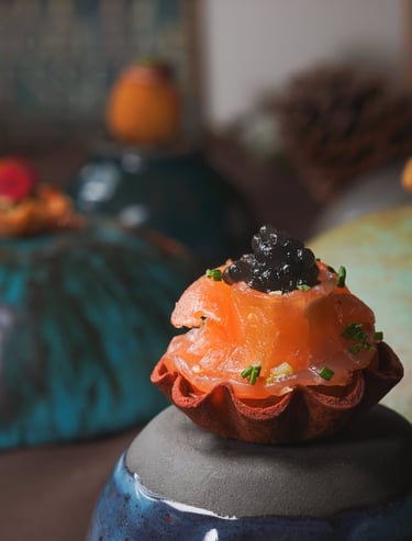 Tartaletė su karštai rūkyta žuvimi, žolelių majonezu ir marinuotomis morkomis